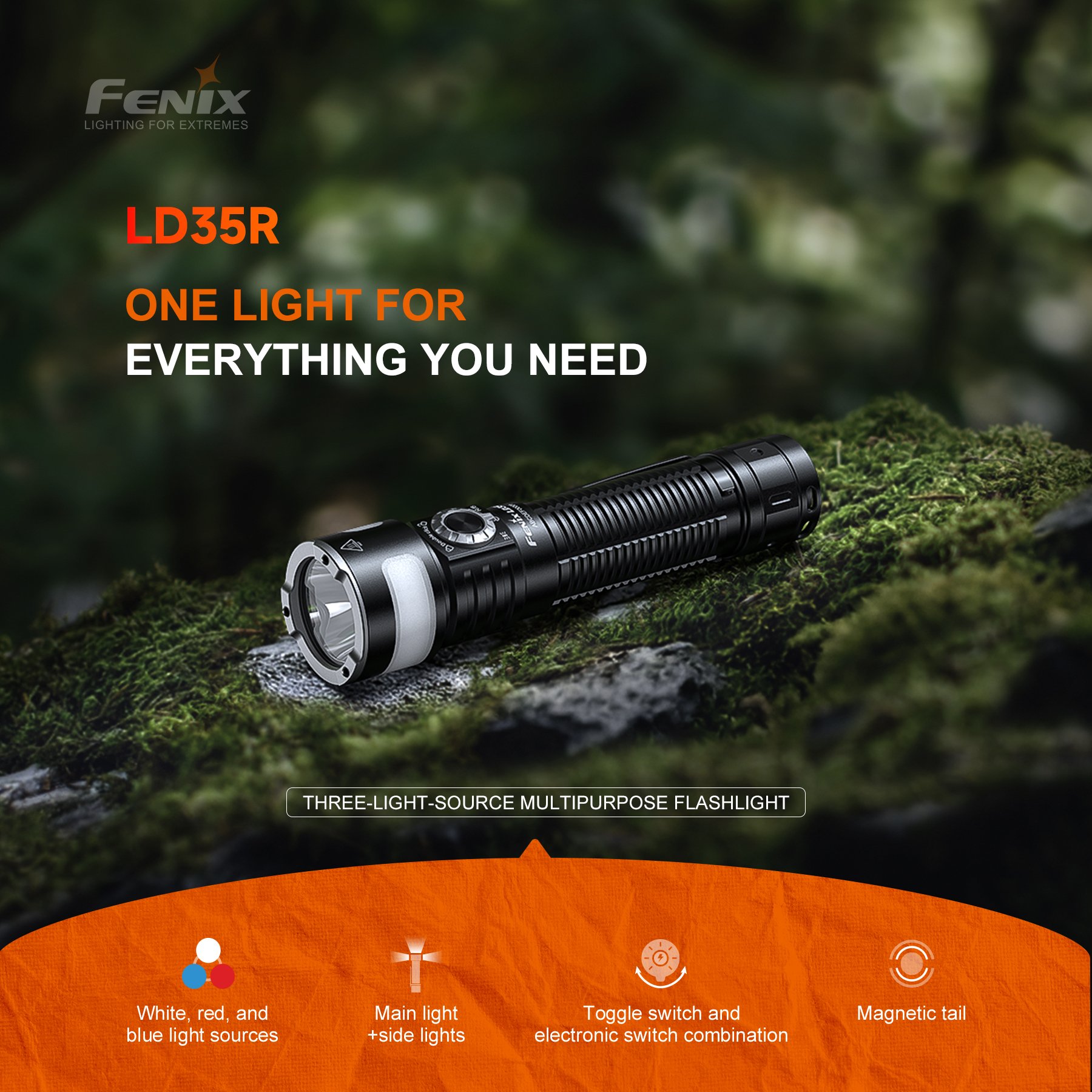 Fenix LD35R, beyaz, kırmızı ve mavi olmak üzere üç farklı ışık kaynağına sahip, çok yönlü ve kompakt bir el feneridir. Outdoor sporlar, araç bakımı, kamp, günlük onarım ve profesyonel kullanım gibi farklı senaryolar için esnek aydınlatma çözümleri sunar.